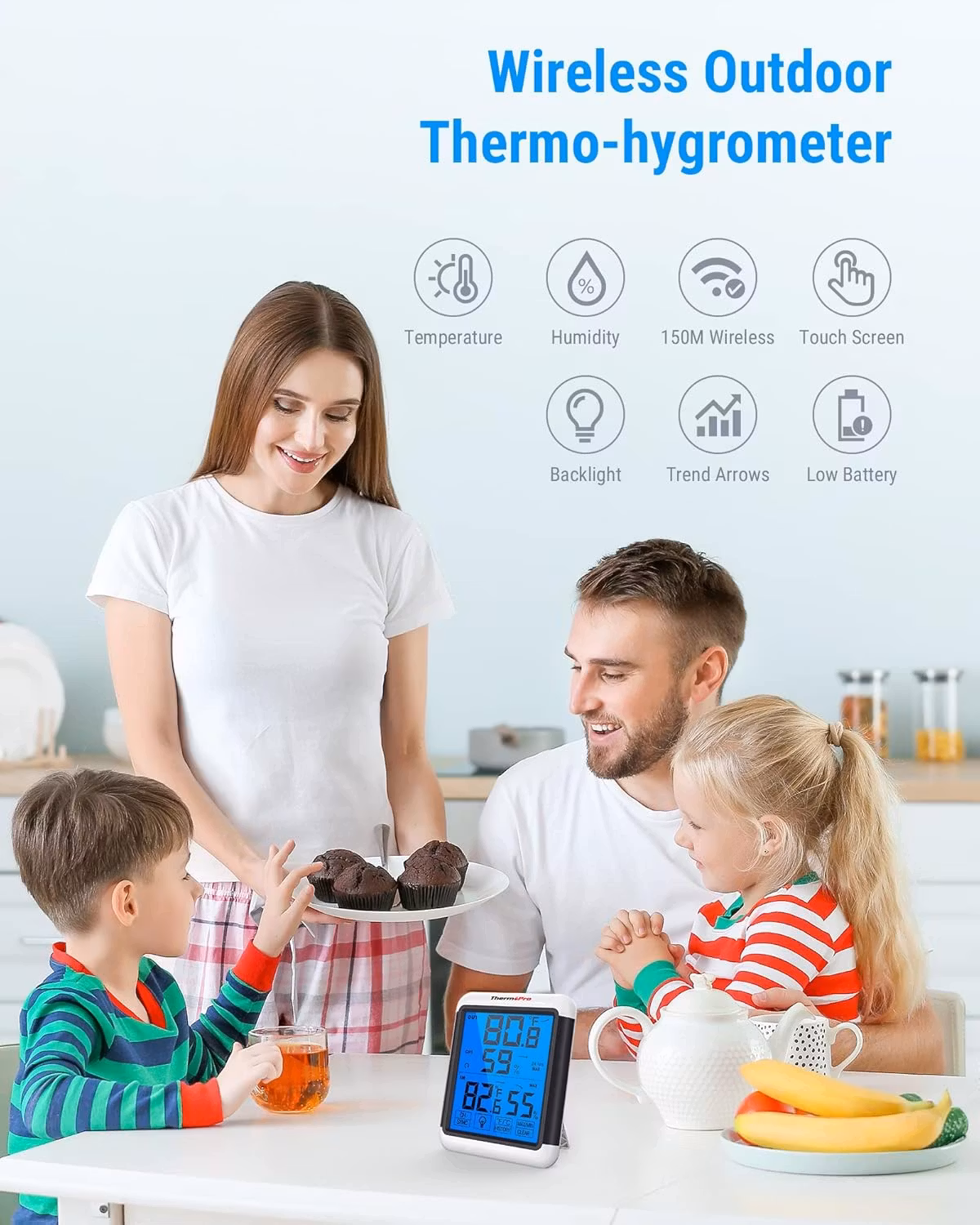 Trådlös temperatur- och fuktighetsövervakning: Mäter inomhus/utomhustemperaturer och luftfuktighetsprocent samtidigt. Kan visa avläsningarna från upp till 3 utomhusfjärrsensorer för att övervaka 4 olika platser samtidigt om du köper ytterligare 2 sensorer