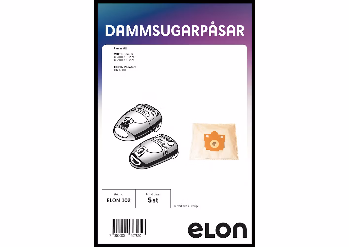 Dammsugarpåsar ELON102 Volta Gemini. 5 st.Kompatibilitet:volta_u2810_u2890_gemini_2,volta_u2910_u2990_gemini_2,hugin_phantom_hn_6000Antal påsar 5 st.EAN 7350000