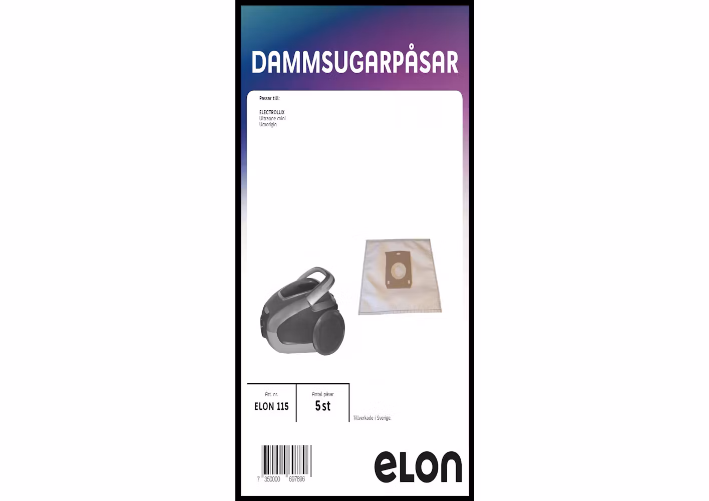 Dammsugarpåsar ELON115 Electrolux Ultraone mini. 5 stKompatibilitet: electrolux_ultraone_mini,electrolux_umoriginAntal påsar 5 st.EAN 7350000697896