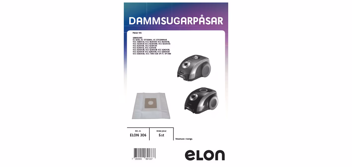Dammsugarpåsar ELON306 Samsung SC 5120. SC 6240. 5 st.Antal påsar 5 st.EAN 7350000691337