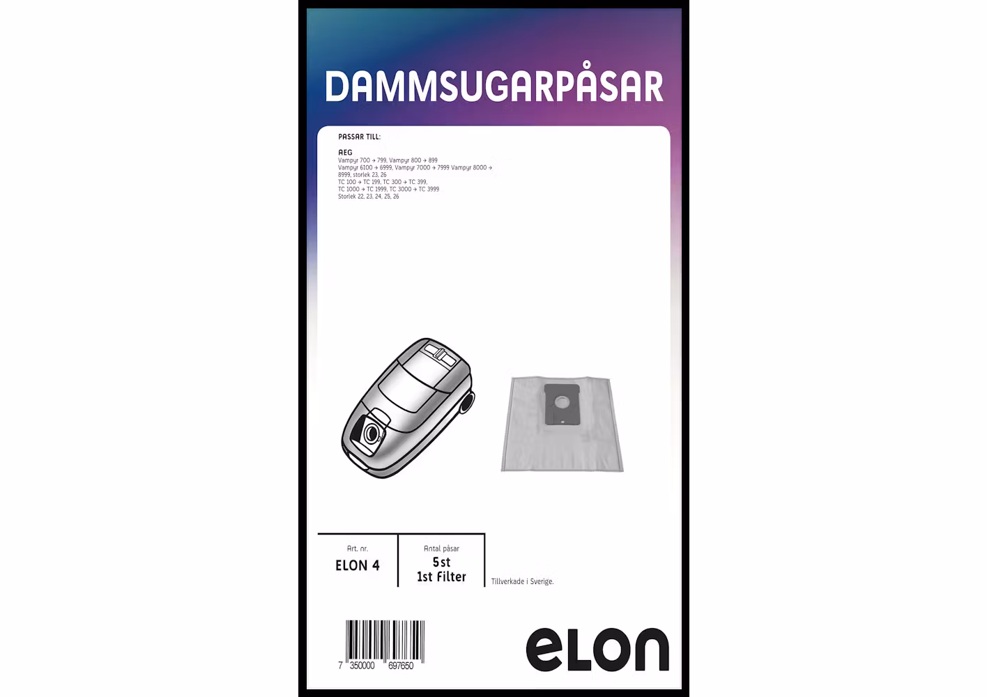 Dammsugarpåsar ELON4 AEG 700. 5 st.Antal påsar 5 st.Antal filter 1 st.Kompatibilitet: aeg_vampyr_700_799_2EAN 7350000697650