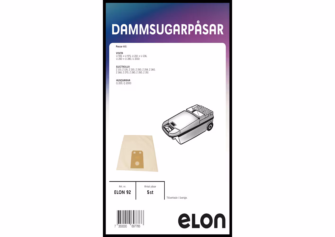 Dammsugarpåsar ELON92 Volta U 250-U 280. 5 st.Kompatibilitet: electrolux_z250,electrolux_z280,volta_u250_u280_2Antal påsar 5 st.EAN 7350000697766