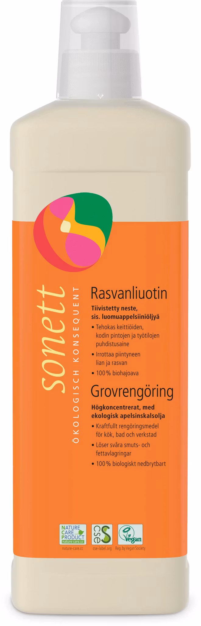 Ekologisk grovrengöring som löser svåra fett och oljerester. 100% biologisk, endast växtbaserade ingridienser. Utan petrokemiska tensider, parfym, syntetiska doftämnen, färgämnen och konserveringsmedel. Produkten innehåller inte heller några enzymer eller blekmedel.