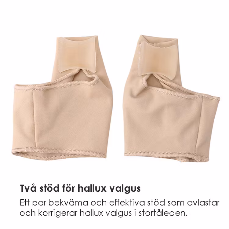 Ett par (2st) mjuka och bekväma stöd för hallux valgus. Stöden korrigerar och ger stöd åt stortåleden så att den hamnar i rätt läge. Den töjbara strumpan gör att stöden passar alla fotstorlekar för både män och kvinnor.