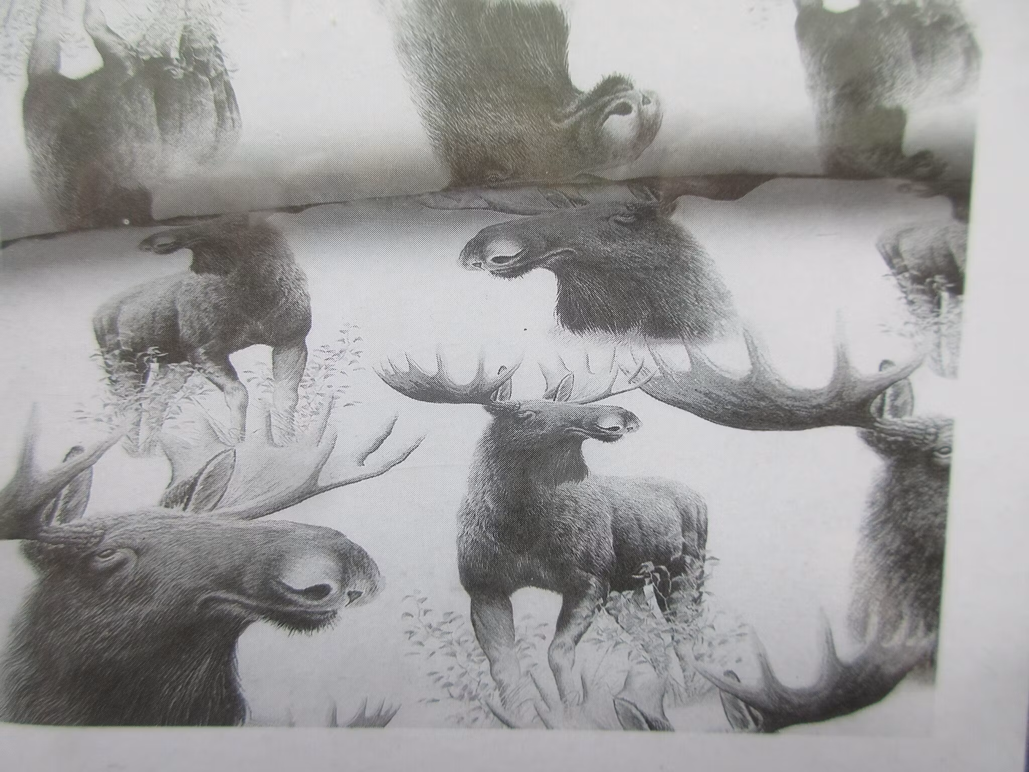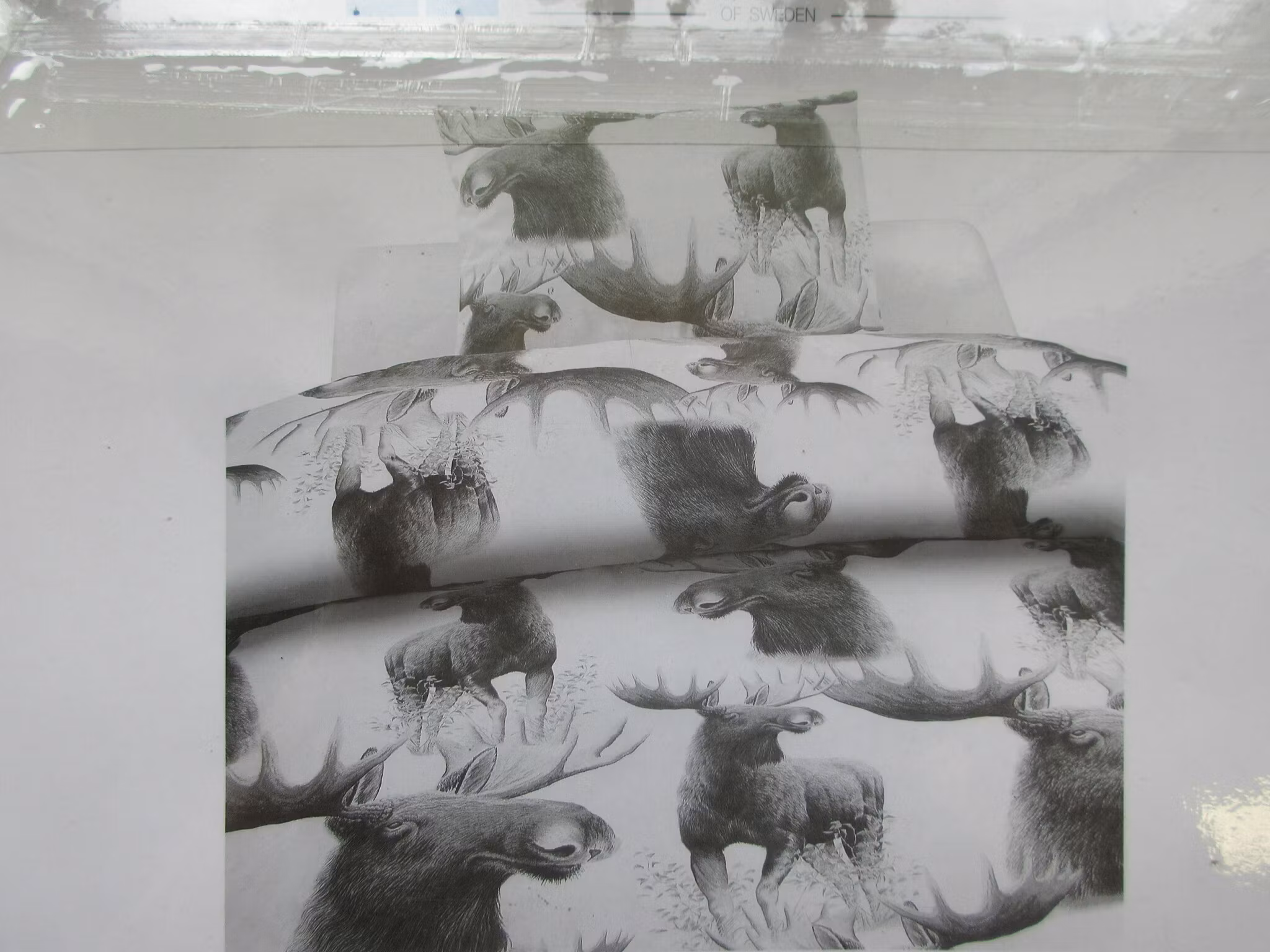 Härligt påslakanset med tryck av älgar i skogsmiljö i grått på en vit botten.