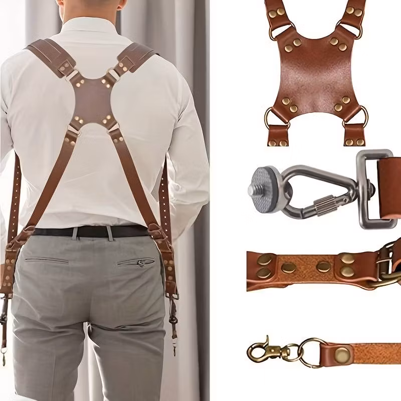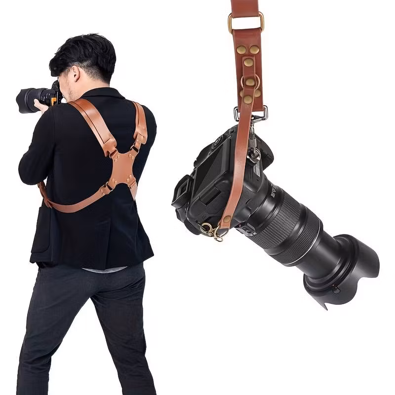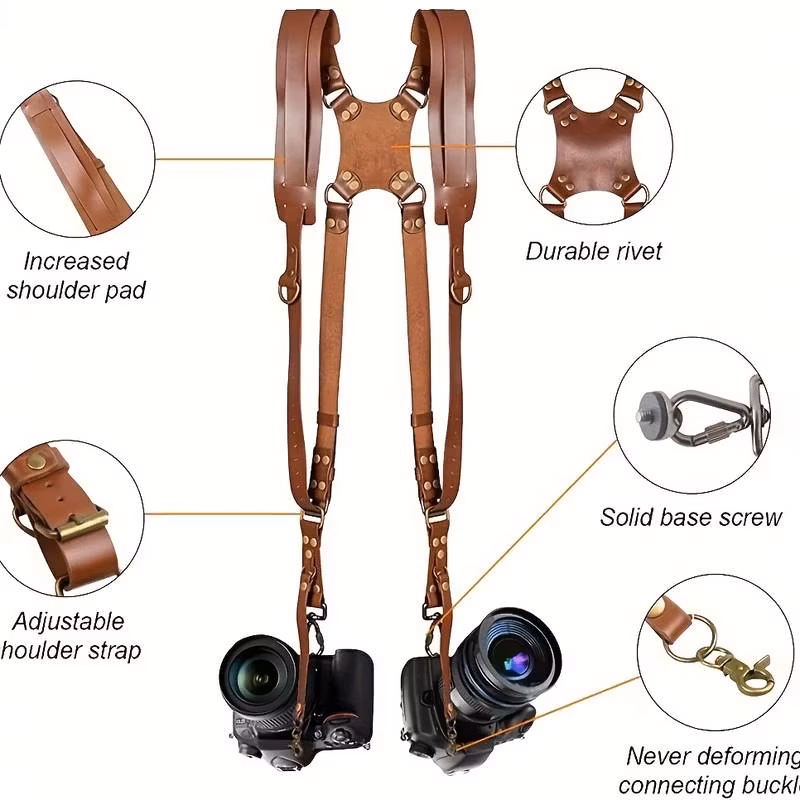 This dual strap is great solution to have two cameras near you. We can imagine how it's will make your busy working day go easier and smoother. Design to fit all camerasBEST FOR YOU straps made out from high quality leather, and high-quality metal d-rings. Double security to keep your camera safe. They made to last lifetime.WORK IN STYLE ; Harness were created in absolutely beautiful design, not only comfortable but made to keep you in style. Worn in "X" pattern across back, and its perfectly distribute the weigh on both sides. Holds two cameras near your hips. Easy access to grab your camera any time you want to capture a moment.