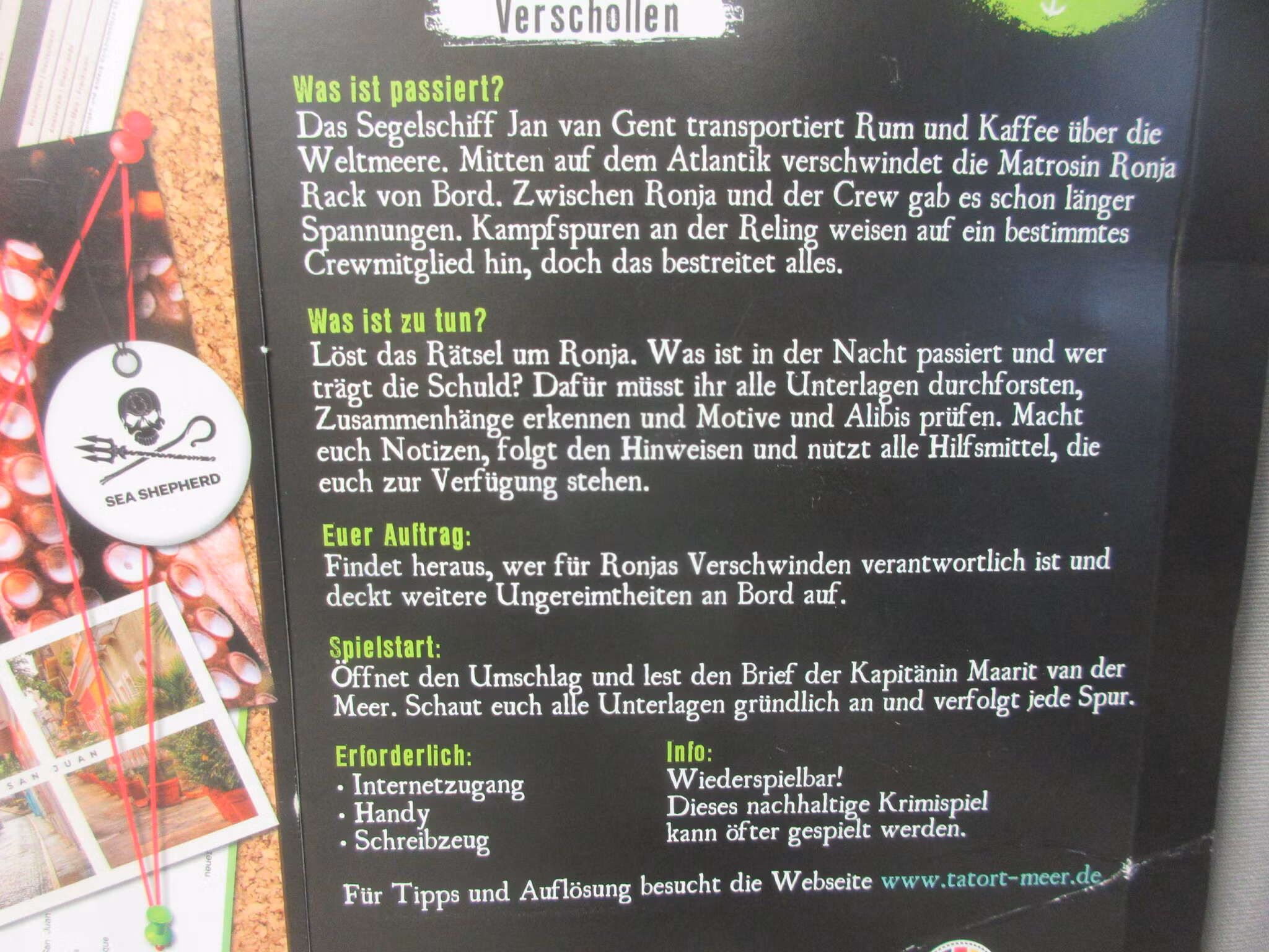 Förpackning: Vad hände på segelfartyget "Jan van Gent" och vad har Sea Shepherd-aktivisten att göra med det? Du förväntar dig en multimedial spelupplevelse med varierade spelmaterial och med ett omslag till det verkliga livet.