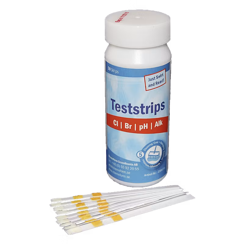 Teststickor (pH/klor/brom/alkalinitet) mäter pH-värdet, klor-eller bromvärdet och alkaliniteten i vattnet.