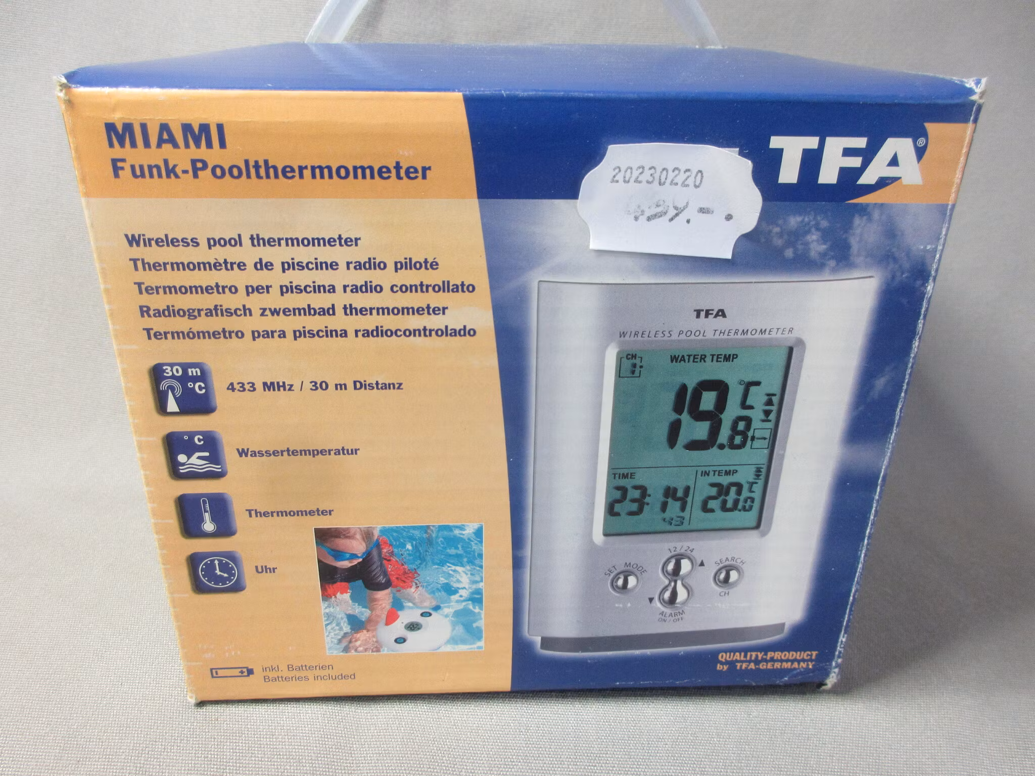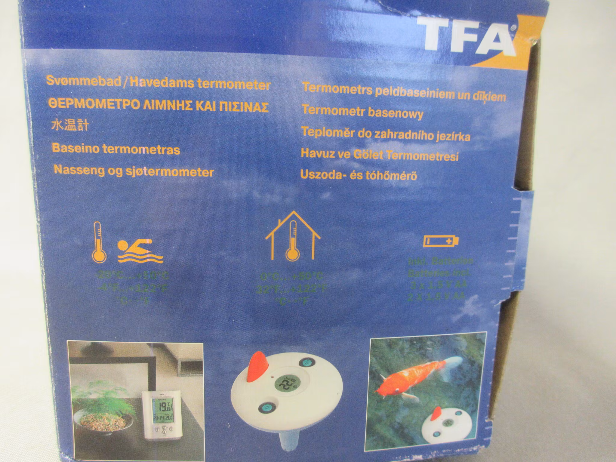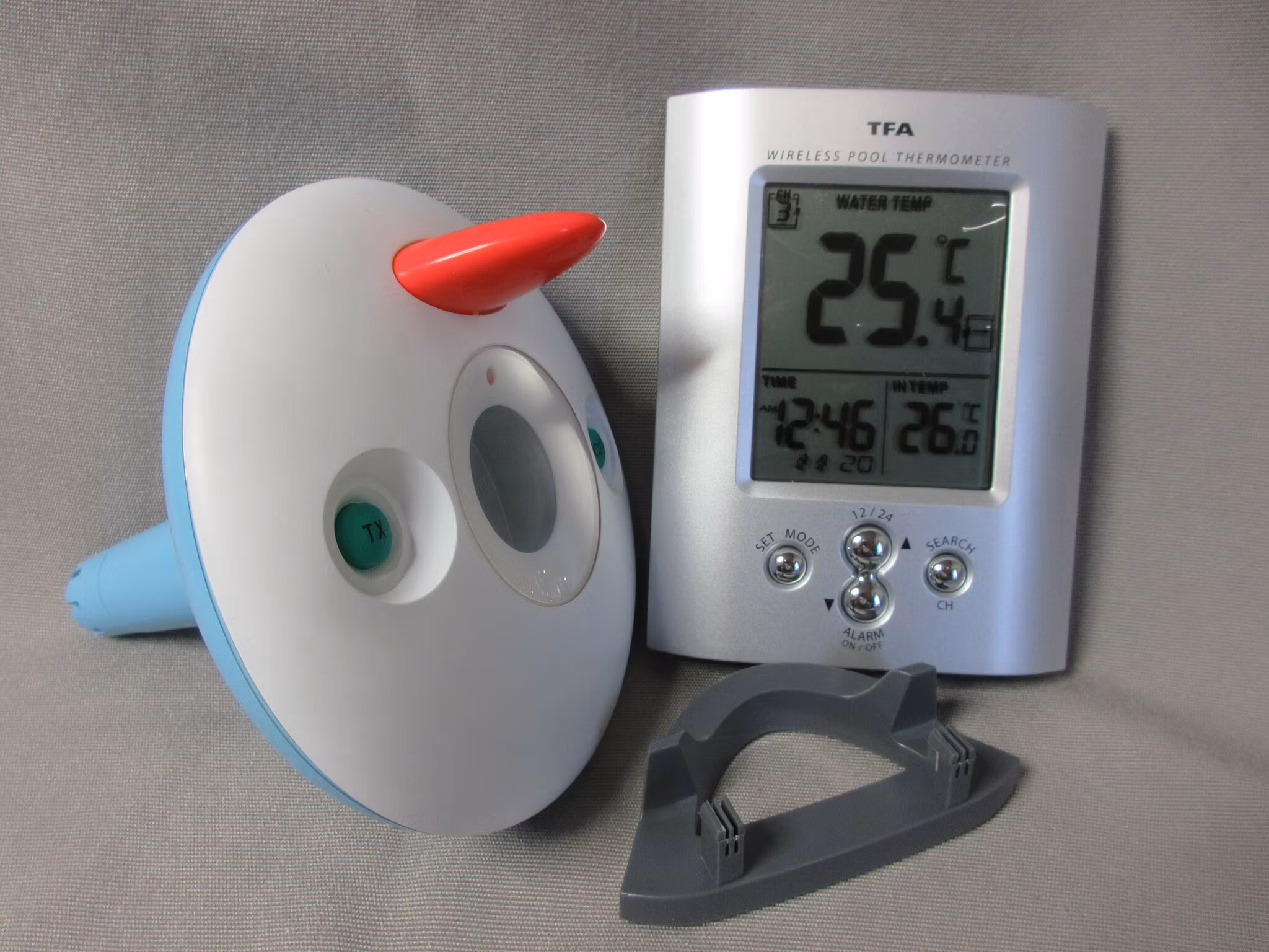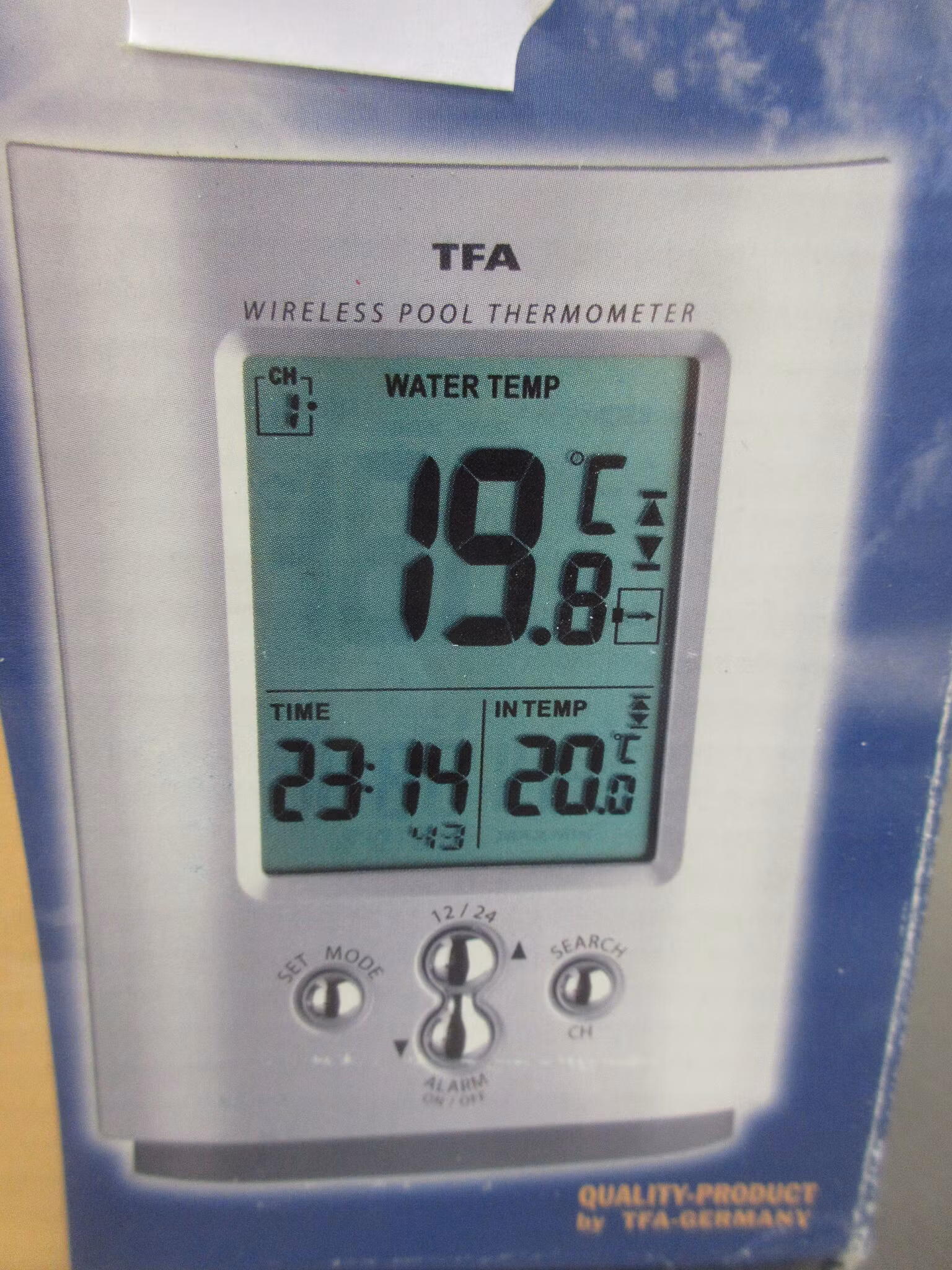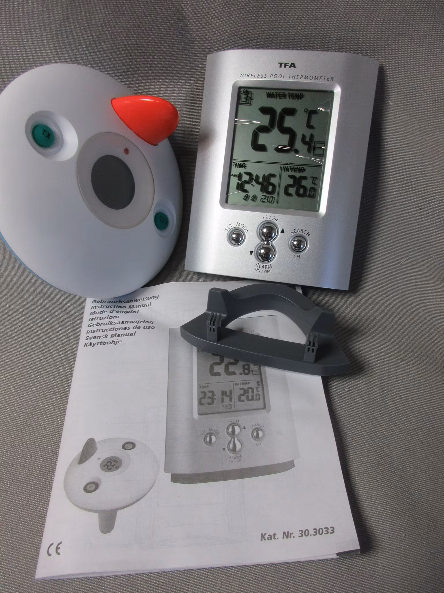 Digital termometer med trådlös flytande givare. Räckvidd upp till 30m. Visar vattentemperatur, innetemperatur och klocka mm.